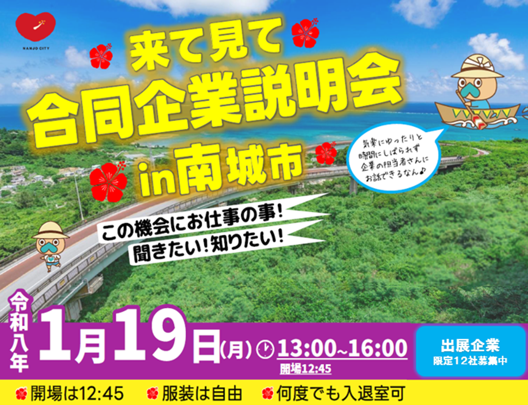 このたび、南城市雇用創出サポートセンターでは、地元就職の促進と企業の人材確保を目的として、下記の通り「来て見て合同企業説明会 in 南城市」を開催いたします。